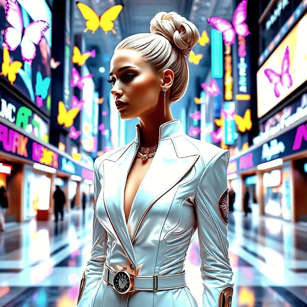 A striking picture of a cyborg in a futuristic plaza. The figure wears a white and rose gold jumpsuit and has a translucent body. The image is 8k and in a cyberpunk aesthetic.