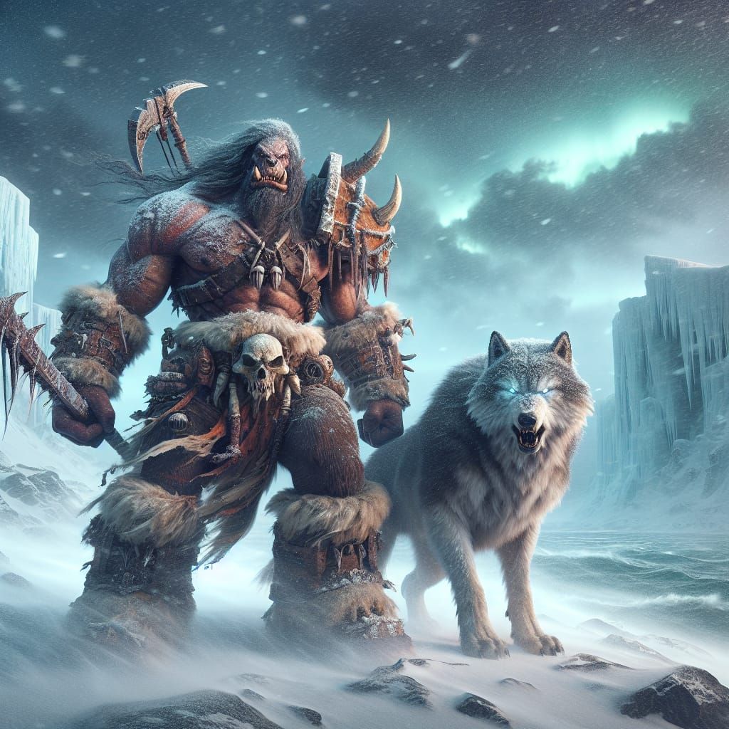 A towering brown orc wearing bone armor stands on an icy tundra alongside his fierce grey wolf companion. The piercing wind whips up snowstorm around their feet while the orc's weapon glimmers in the frosty light. Frost particles cling to his armor, made from the bones of defeated beasts. His wolf companion ...