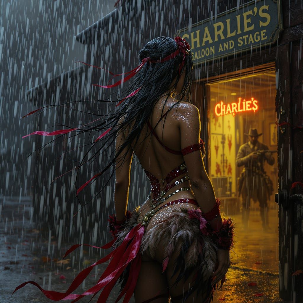 This image shows a steampunk showgirl in a dramatic, rain-swept old west setting. The woman's black hair and sequined leotard are adorned with red ribbons. The background is muted with hints of autumn colors.