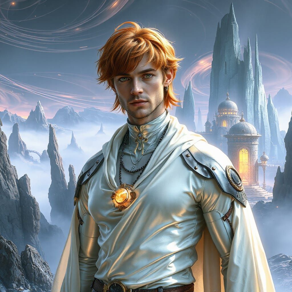 This image shows a stylish cyborg man in a flowing, futuristic outfit standing in an alien landscape. The artwork features a biomechanical aesthetic with iridescent mist and crystalline structures.