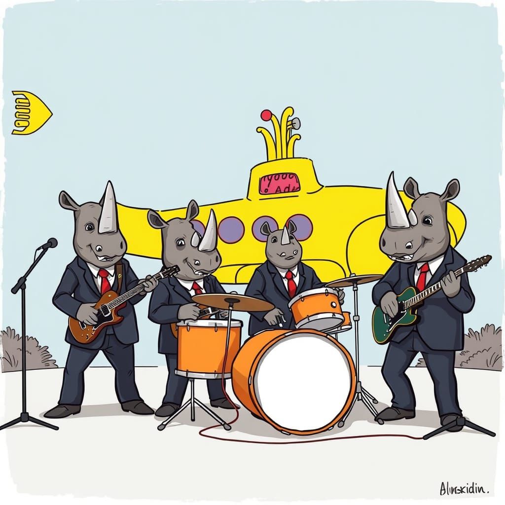 This image shows a cartoon of four rhinos dressed in suits as a rock band. One is playing drums with a yellow submarine in the background.