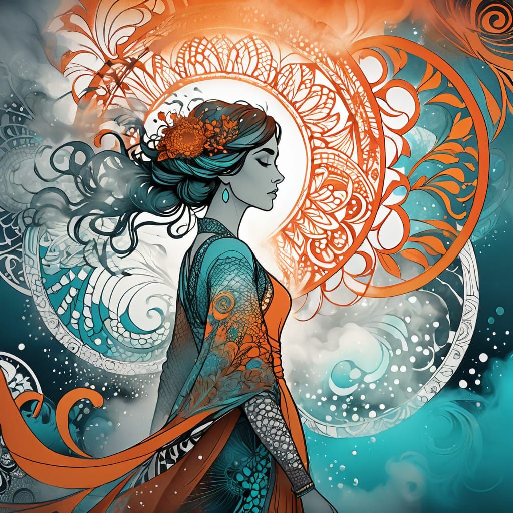 A digital matte painting of Recovery Girl standing in smoke with dynamic lighting. The image is in a vibrant orange and teal color scheme with intricate details, as if rendered in Unreal Engine 5.