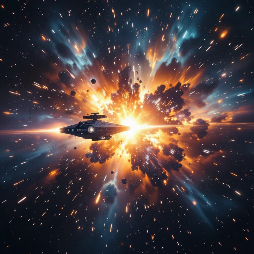 A cinematic film still captures a majestic supernova explosion in deep space, with vibrant nebulae and cosmic dust, rendered with dramatic lighting and intense flares.