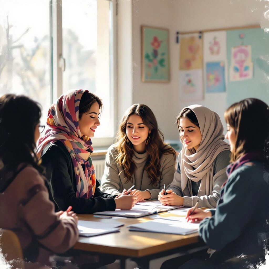This image depicts an Iranian female teacher in a scarf, leading an English lesson for five female students. The scene captures focused learning with soft natural light and warm tones, rendered with visible brushstrokes.