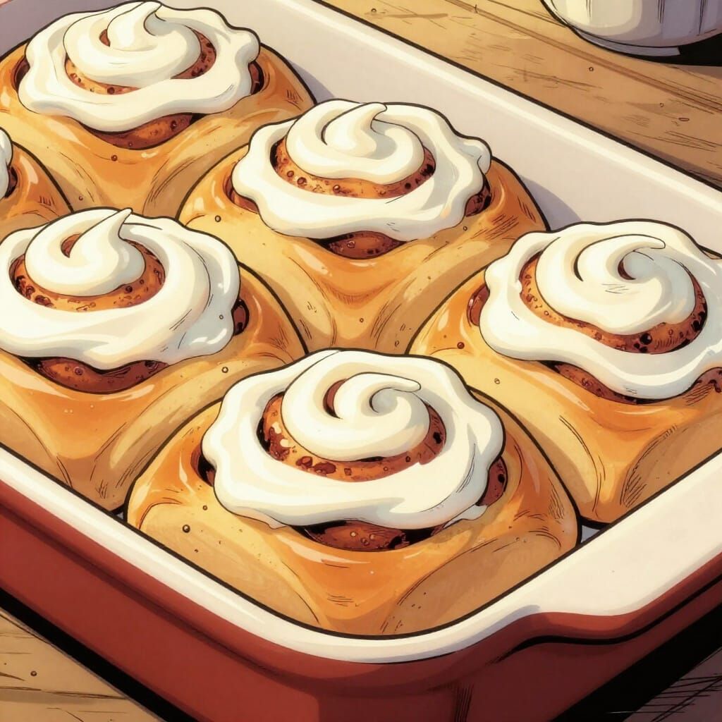 This image displays cartoon cinnamon rolls generously topped with white frosting, presented in a rustic baking dish. The art style features vibrant colors and high contrast, reminiscent of comic book illustrations.
