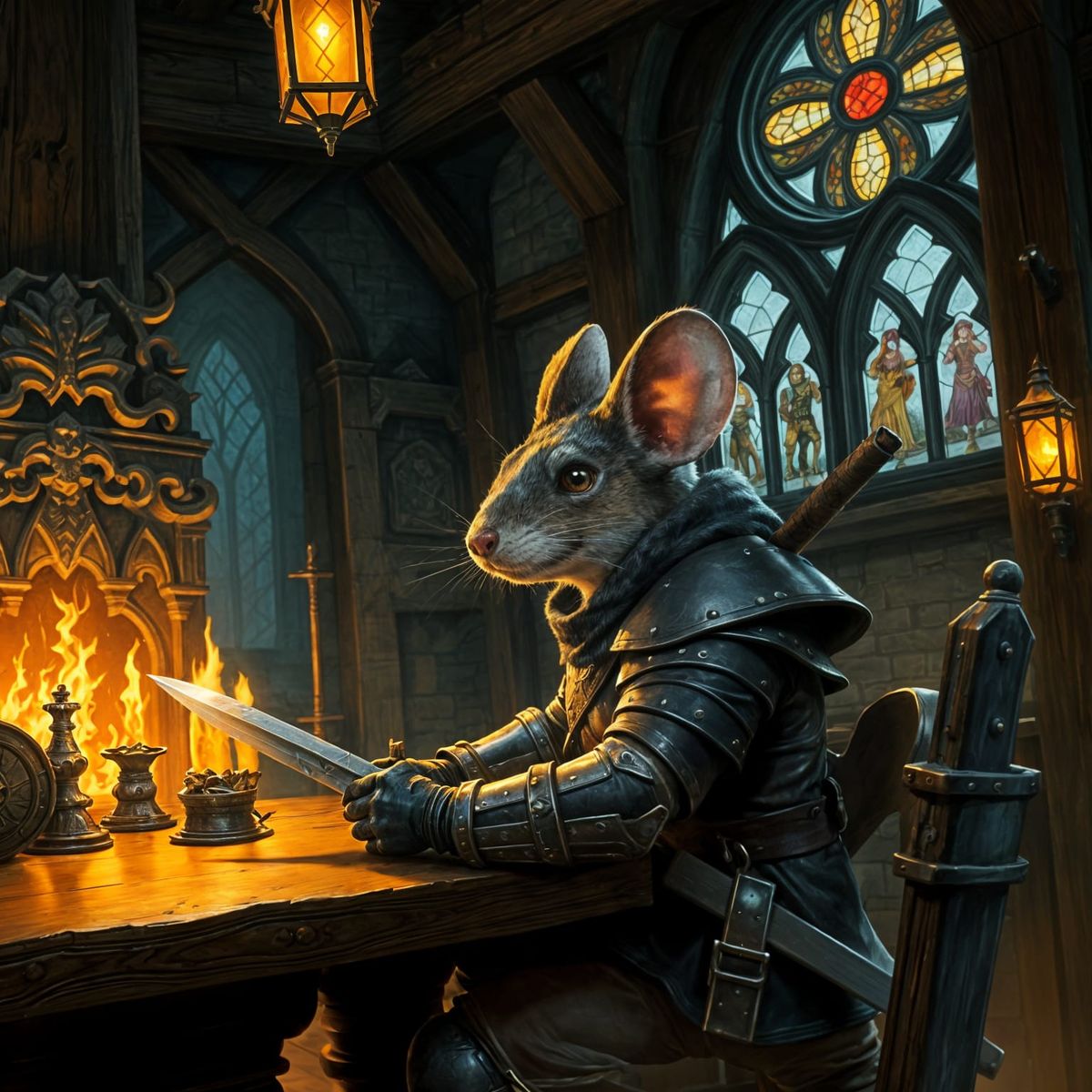 A highly detailed image of a mouse mercenary in dark leather armor, set within a dimly lit tavern. The scene is rendered with high fidelity and attention to anatomical correctness.
