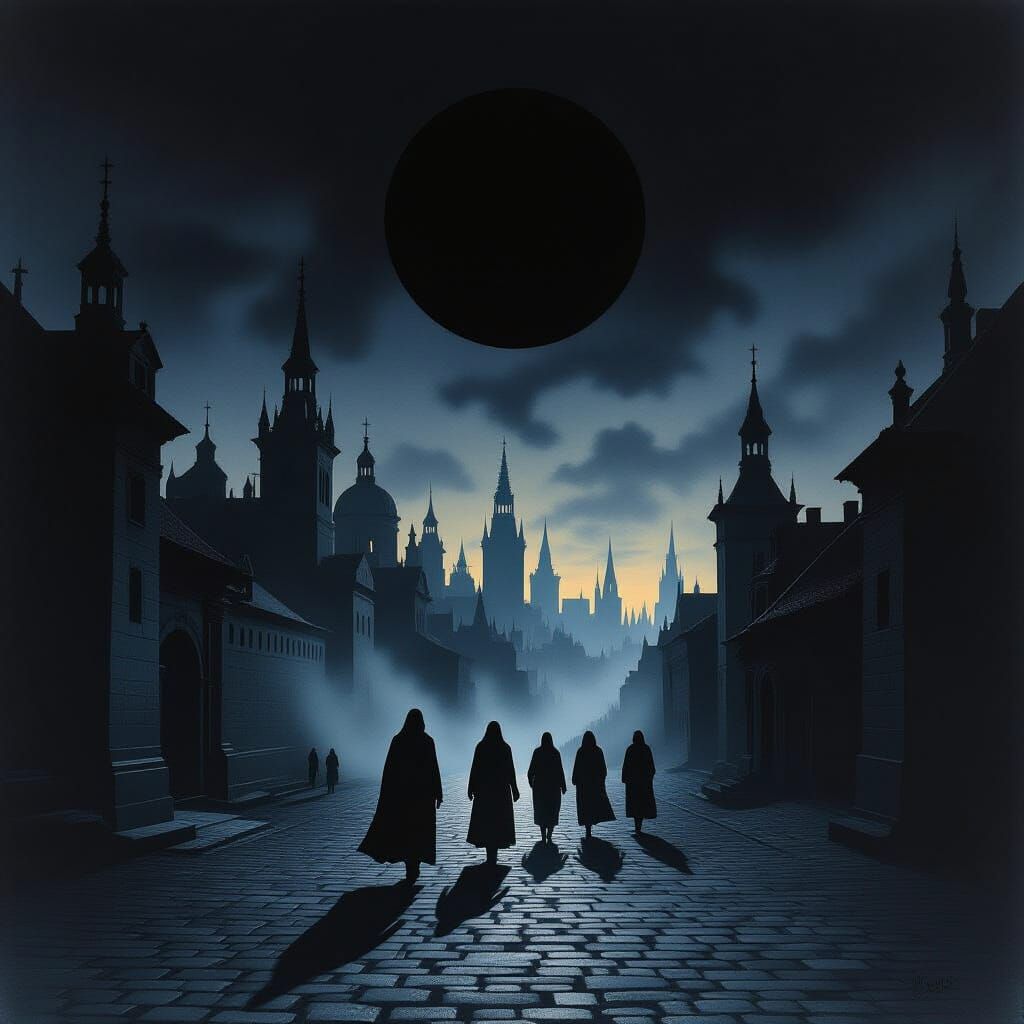 This image depicts a silent, ancient city bathed in twilight under a black sun. Ghostly figures walk backward, their reflections moving uniquely, creating a haunting, surreal dreamscape with dramatic lighting.