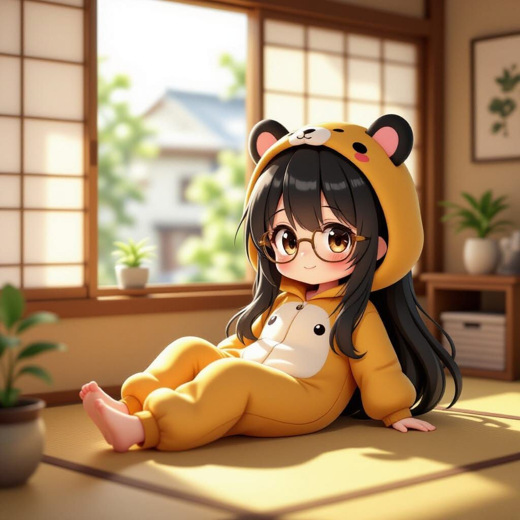 This image shows a cute chibi girl in a unique food-themed onesie relaxing in a sunlit, vintage Japanese room. Features detailed concept art with vibrant 3D anime style, evoking nostalgia.
