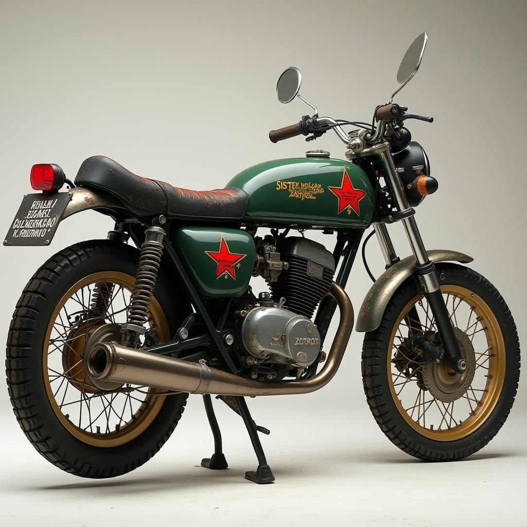 This image shows a vintage 1978 Jawa 250 Ceylan motorcycle with custom modifications. The bike features a dark green fuel tank and distressed seat, rendered in a retro-futuristic style.