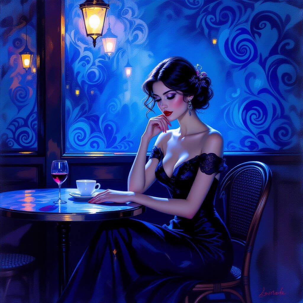 A striking image of a young woman in a moody cafe, bathed in an ethereal glow. Deep blues and purples create a dreamlike atmosphere with painterly softness and intricate detail.