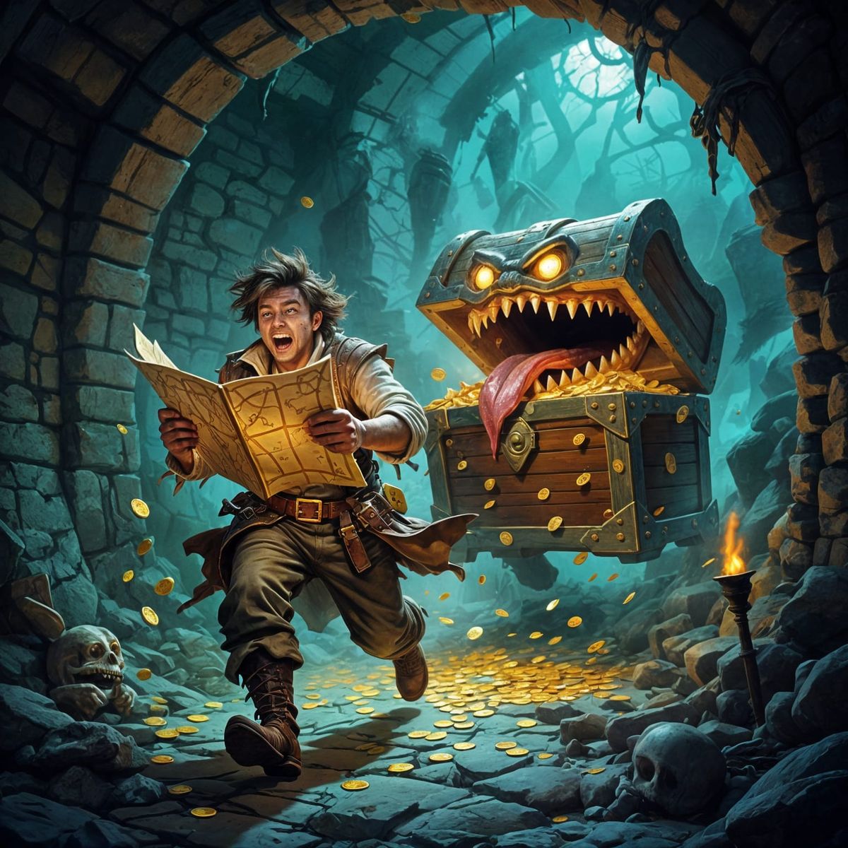 This image shows a comical fantasy scene of a treasure hunter fleeing a mimic chest. The monster chest lunges with sharp teeth in the dark dungeon, as the hapless adventurer drops gold in his frantic escape.