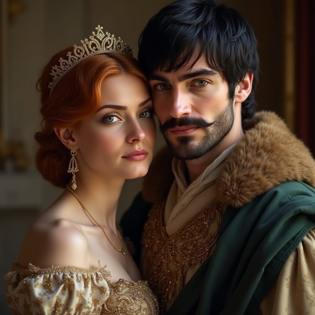 This image shows a portrait of Princess Iphigenia of Mycenae with ginger hair, alongside Cossack colonel Jurko Bohun. He has black hair, blue eyes and wears a traditional 17th-century Cossack robe.