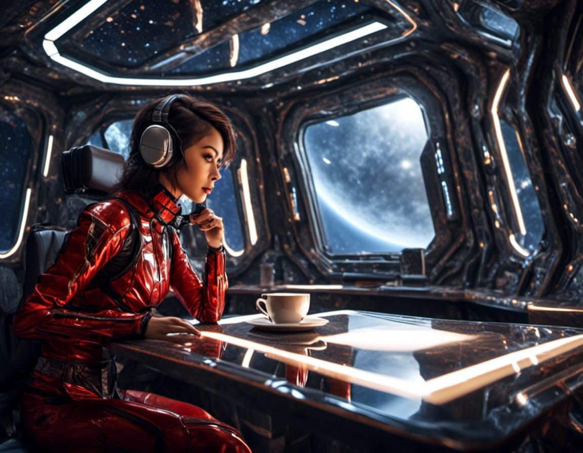 A striking picture of a beautiful woman enjoying coffee in a spaceship. She is seated at a table looking out at the stars, planets, and asteroids in a futuristic sci-fi setting.
