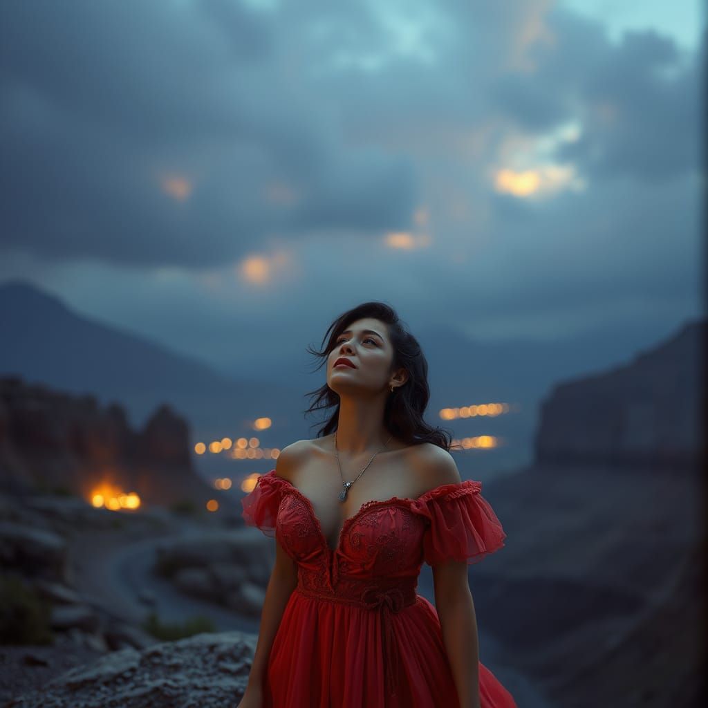 This image is a beautifully rendered oil painting of a lady, capturing a dramatic and atmospheric scene with intricate details and cinematic lighting.
