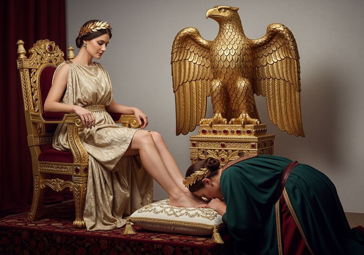 This image shows a Roman Empress sitting on an ornate throne. The Empress is barefoot, with painted toenails, and is attended by a kneeling servant in a photograph with a shallow depth of field.
