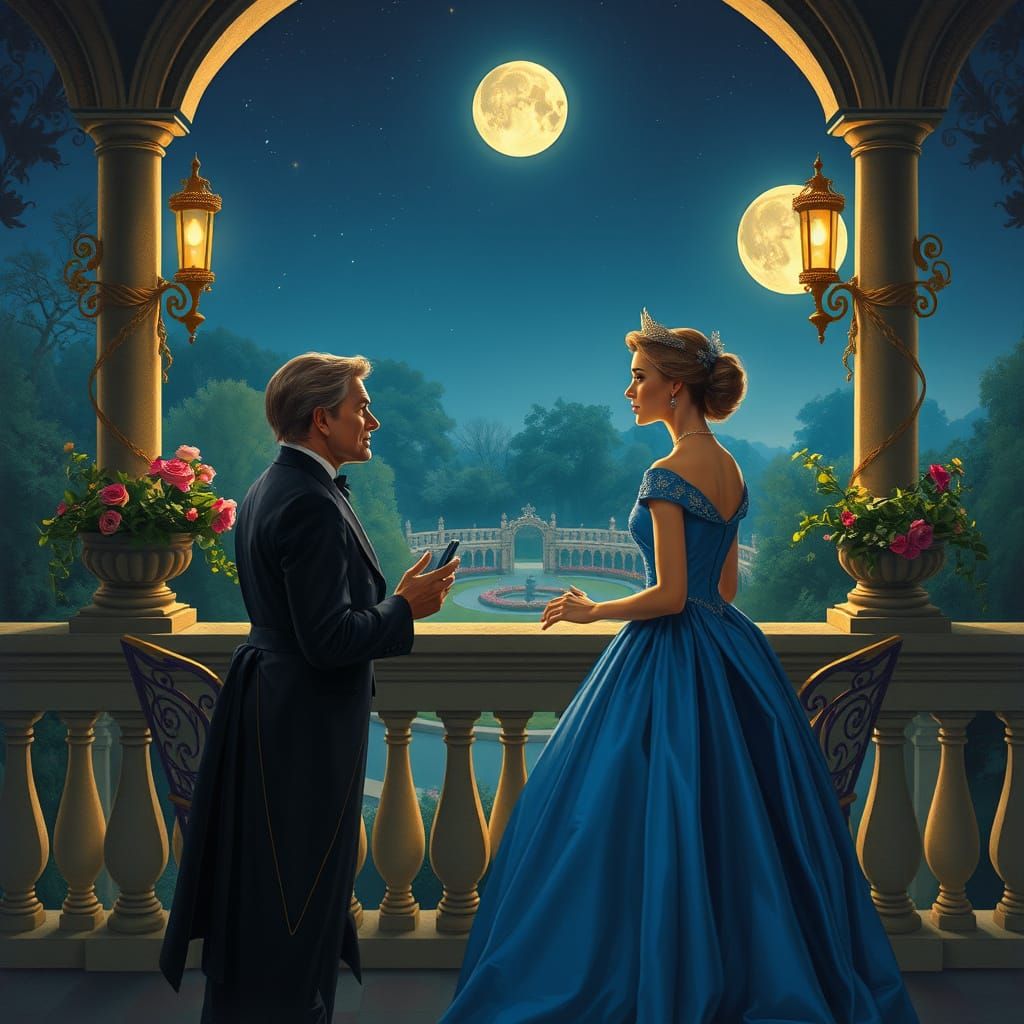 This image shows a romantic scene of Cinderella and her prince in formal attire, standing on a balcony with a garden view under a moonlit night, both holding their phones with bright screens, in a realistic style inspired by the precision of Richard Estes and the soft lighting of Vermeer.