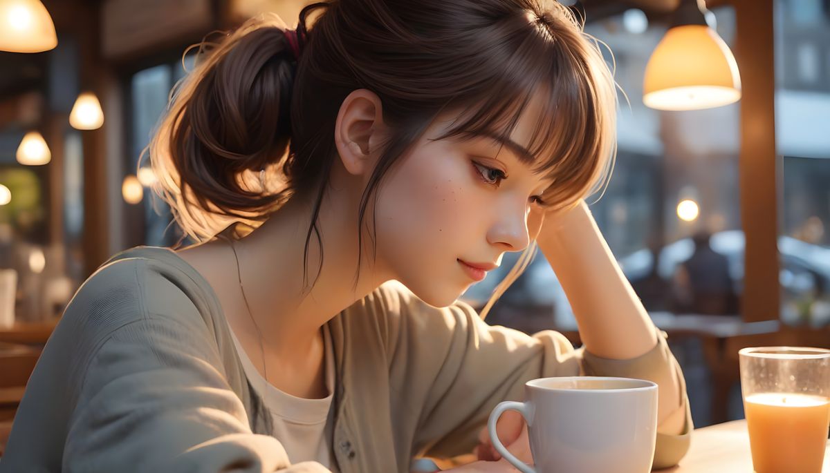 A tranquil anime-style scene of a girl sketching in a cafe. The artwork features soft, warm lighting and pastel colors, creating a peaceful and intimate atmosphere. Rendered in watercolor style.
