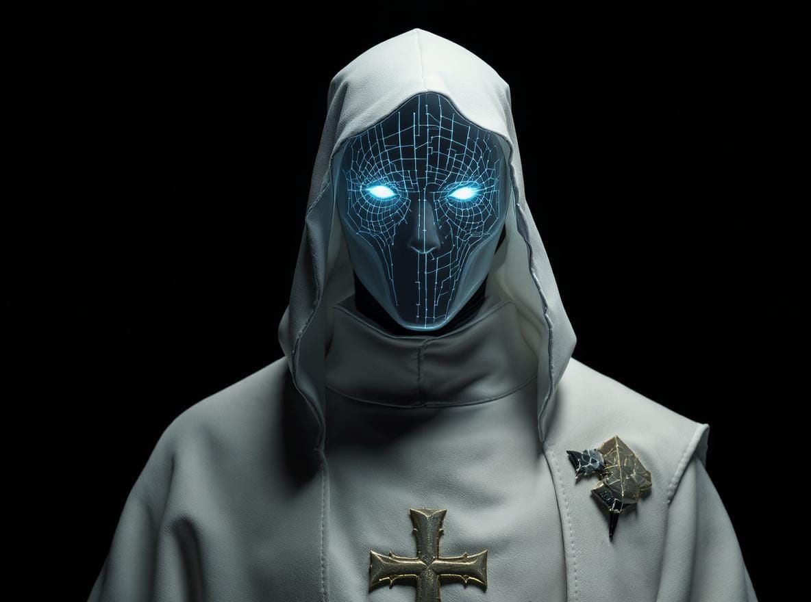 A striking picture of a sci-fi assassin known as the Saint Executioner. The figure is clad in white, masked, and armed with mantis blades, set against a dark backdrop, in a clean, clinical, sci-fi horror aesthetic.
