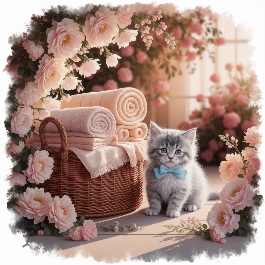 A charming gray kitten with luminous blue eyes and a blue bow sits beside a wicker basket full of towels. Delicate watercolor and digital painting with soft floral accents and warm light.