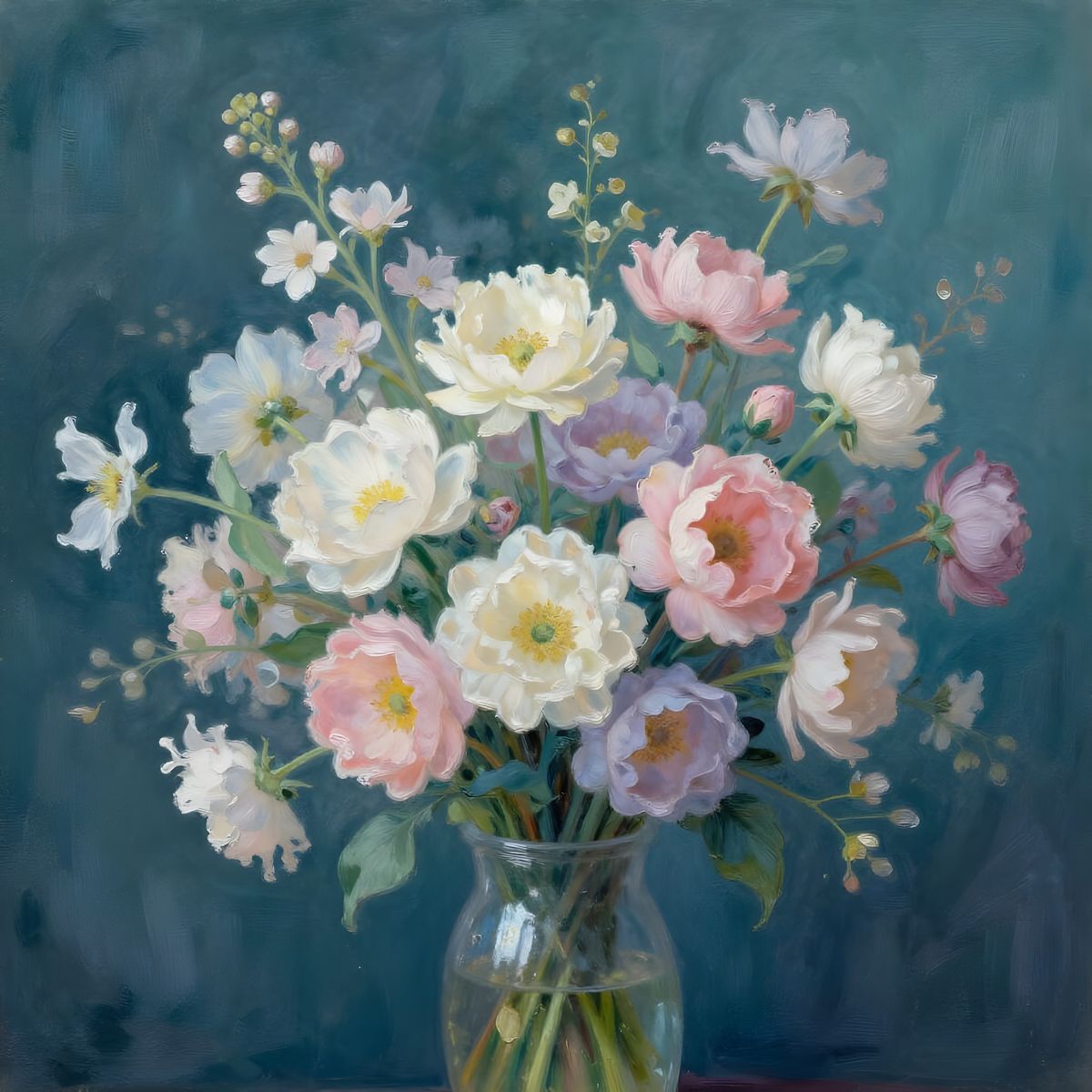 Generate your own soft pastel flower images with a dark teal background, easily and for free.
