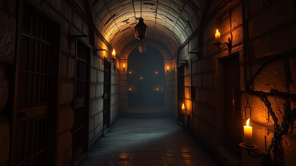 A dimly lit underground corridor lined with worn stone jail cells, illuminated by flickering candles casting eerie shadows, in a dark fantasy style with rich colors and intricate details.