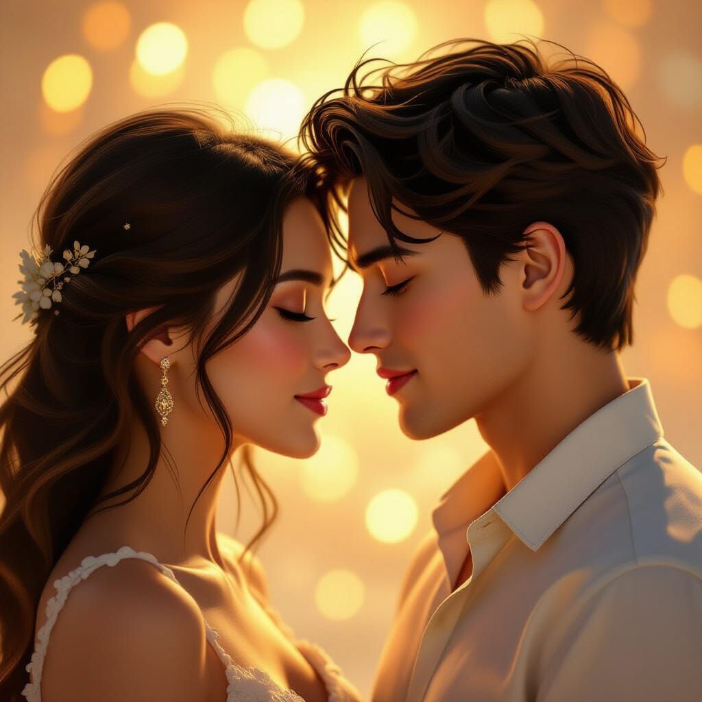 This image shows a young couple sharing an intimate kiss. The portrait, illuminated by warm light and soft focus, showcases hyperrealistic details and vibrant colors with dynamic lighting.