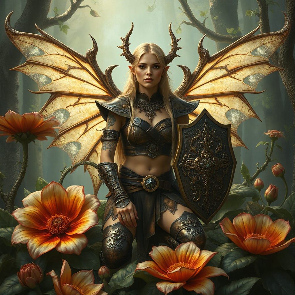 This image shows a fae warrior kneeling among luminescent flowers. The warrior has floral tattoos and arcane steel etchings, with wings of enchanted bark and crystal. Vines move protectively behind her in a mystical, industrial style.