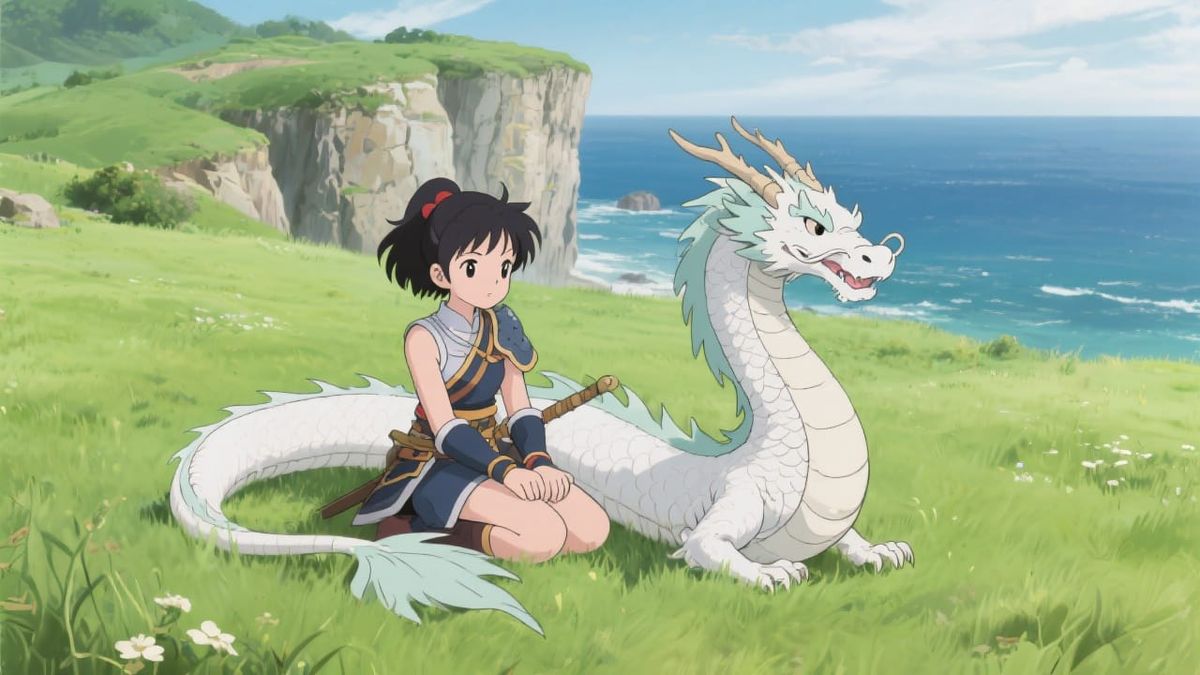 This image shows a young anime-style warrior girl with her white dragon companion in a field. The artwork is reminiscent of Toriyama's style, with a scenic cliffside and ocean backdrop.