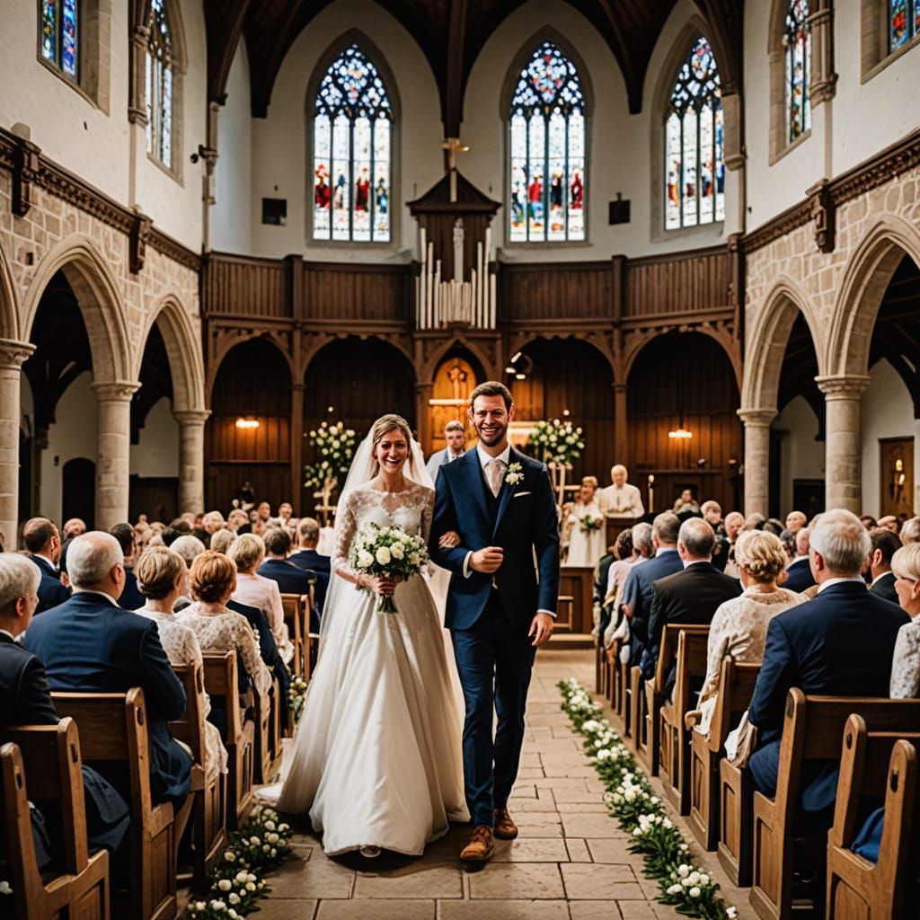 This image captures a picturesque country wedding scene in a charming rural church, surrounded by lush greenery and serene countryside beauty.
