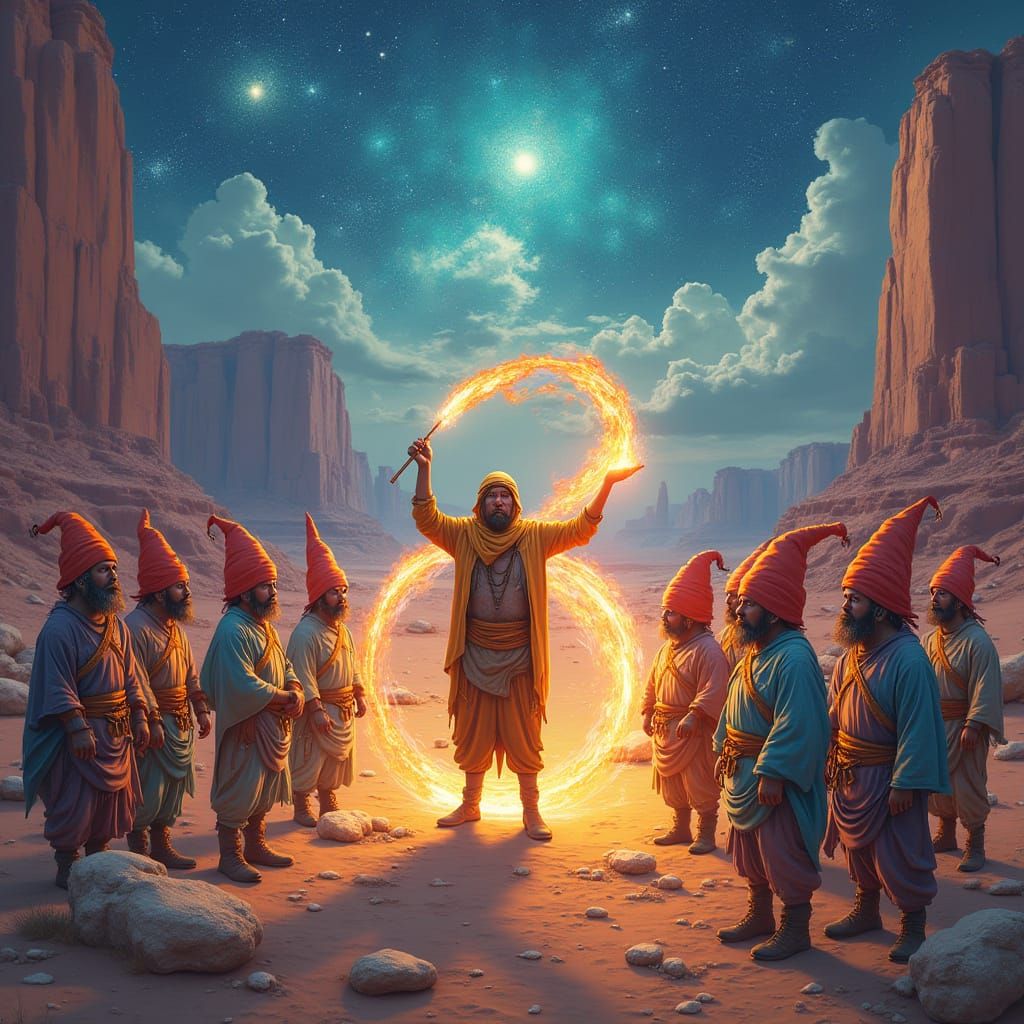 A striking picture of a lone desert performer spinning fire. Nine gnomes in vibrant hats surround him amidst a desert landscape featuring mountains, waterfalls, and a cosmic aura, as a holographic astral illustration.