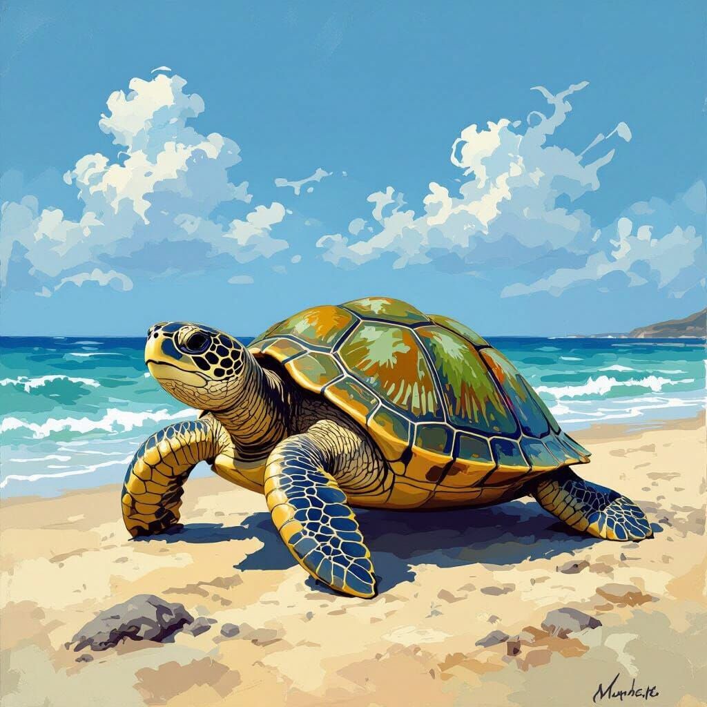 A loggerhead turtle rests on a beach under a blue sky with light clouds. This image captures the scene in an impressionistic style, with soft colors and realistic details.