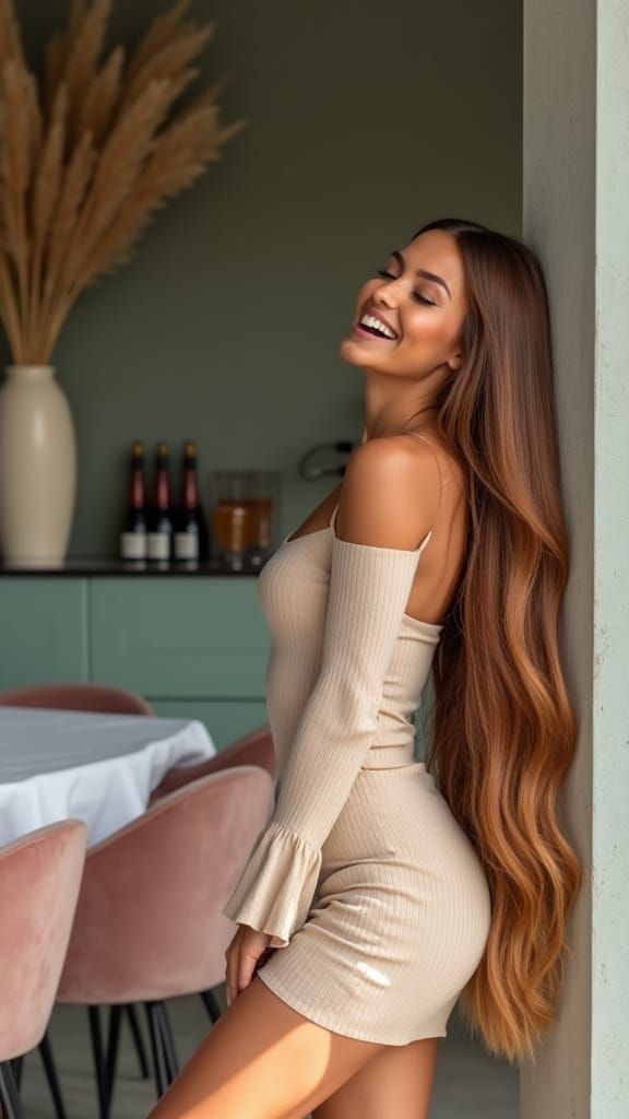 A captivating portrait of a woman caught in mid-laugh, surrounded by modern decor and warm natural light, exuding charm and radiating joy.