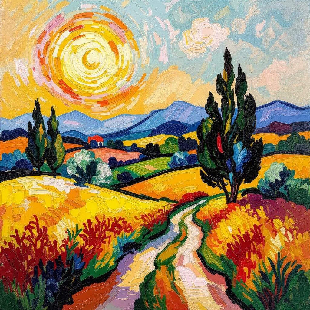 This image shows a vibrant landscape featuring rolling hills and tall trees bathed in warm sunlight. The scene evokes neo-impressionism and expressionism, employing impasto techniques with thick layers of colorful, textured oil and acrylic paint.