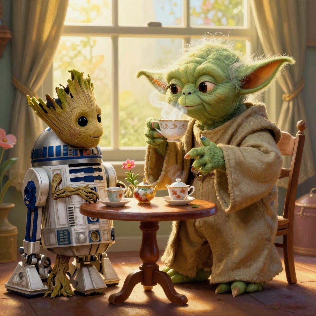 This image depicts a heartwarming scene of Master Yoda sharing tea with Baby Groot, with R2-D2 nearby. Rendered in a vibrant, painterly style with soft, glowing light.