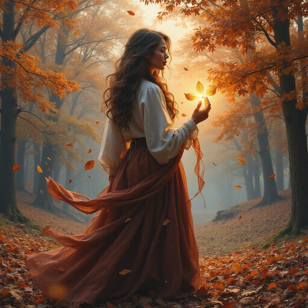 A detailed dramatic painting of the spirit of autumn as a woman surrounded by frosted leaves in a fantasy landscape. The image is rich with autumn colors.