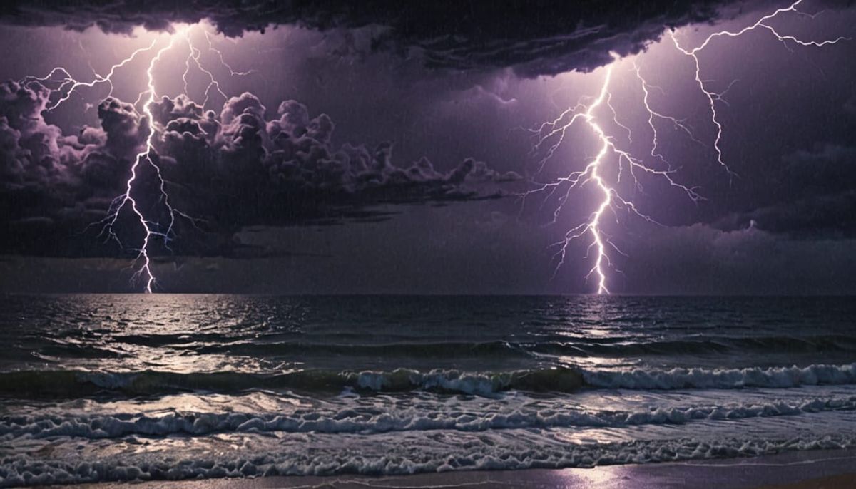 This image shows a nighttime storm over a beach with dramatic lighting. Electrical discharges illuminate dark, ominous clouds in a vibrant purple and blue color scheme. Rendered as digital painting.
