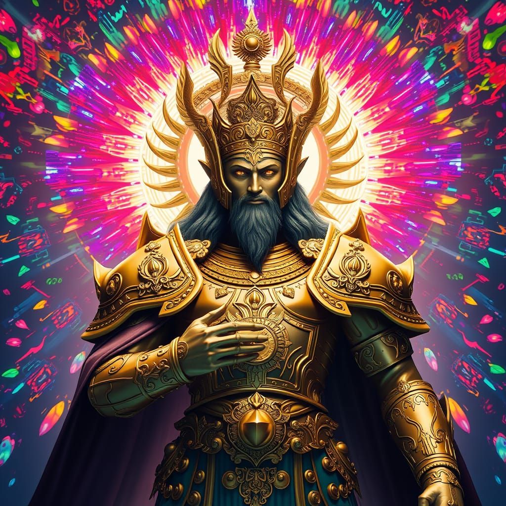 A striking picture of a godlike figure clad in ornate golden armor. A futuristic, surreal aesthetic uses radiant light and intricate details against a vibrant kaleidoscope of colors.
