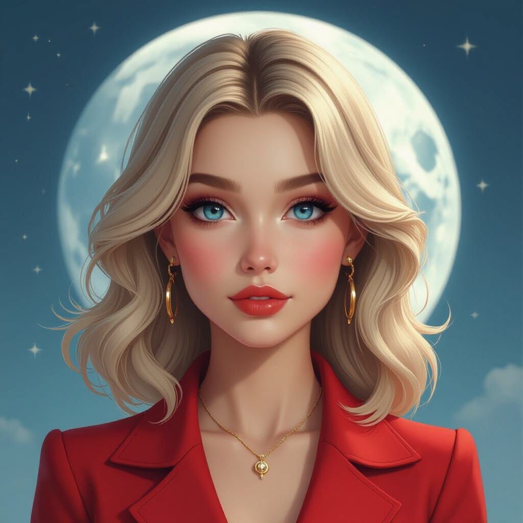 A striking portrait of a blonde woman with blue eyes, set against a small moon. The artwork features dramatic lighting and vibrant colors, as 3D rendered digital art with intricate details and textures.