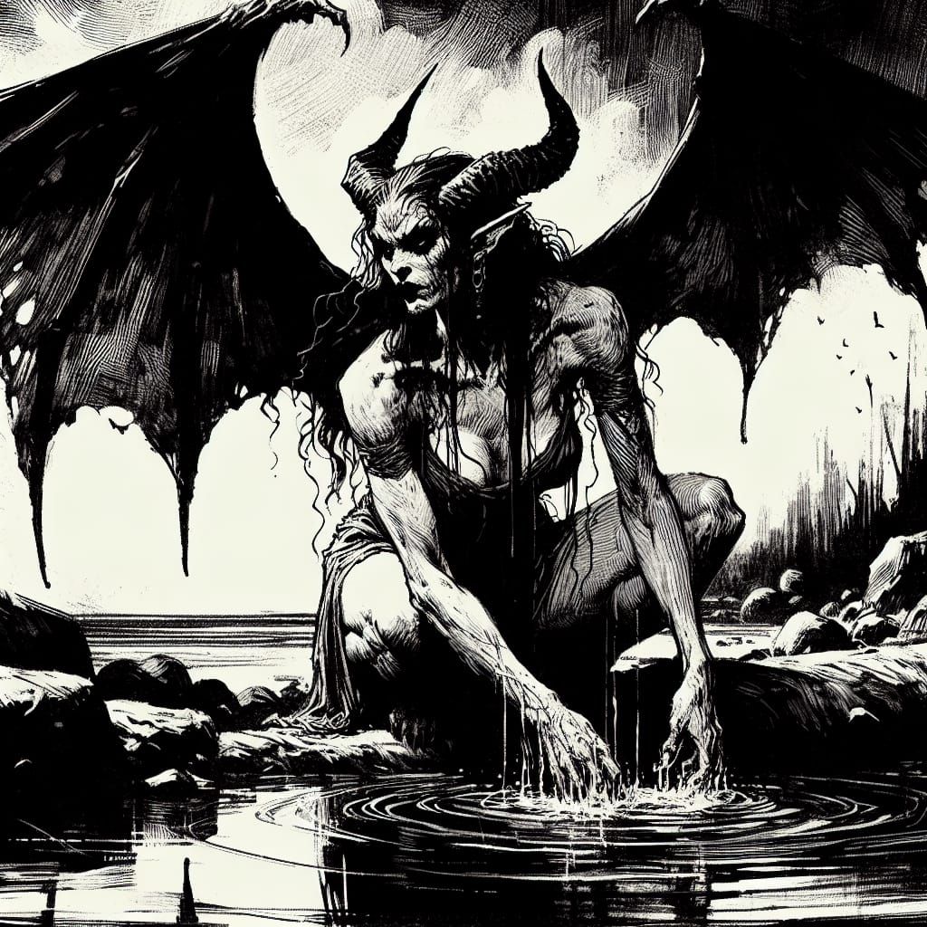 This image shows a muscular demon washing clothes in a river. The artwork features stark contrasts, heavy black lines, and scratchy textures, creating a dark fantasy aesthetic.