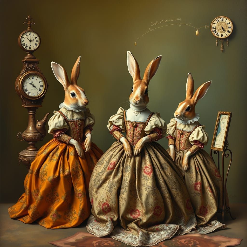 A surreal image of rabbits in Renaissance attire. The artwork blends realism with dreamlike elements, reminiscent of surrealist paintings, with melting clocks and distorted objects.