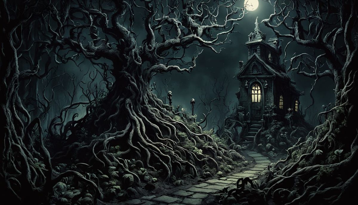 A close-up image of a miniature creepy garden at night, rendered in dark fantasy style. Macabre details, ominous lighting, and twisted roots create a high-contrast, atmospheric scene.