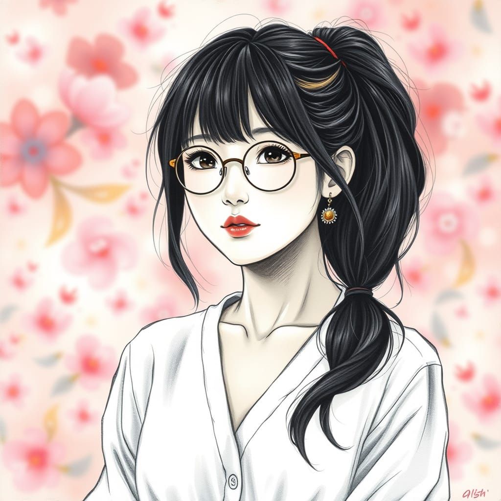 A charcoal drawing of an Asian woman with black hair in a ponytail, wearing glasses and a white blouse, against a blurred background. The image has a whimsical aesthetic.