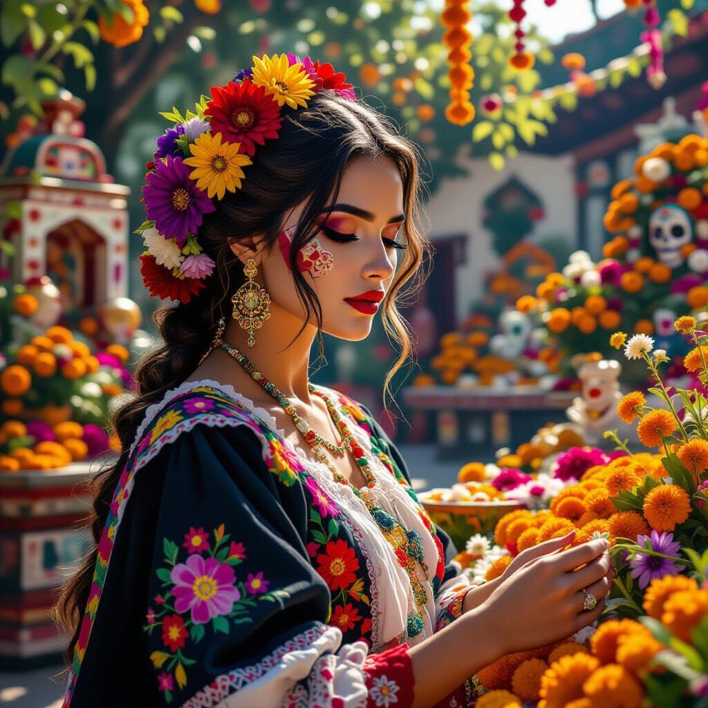 This image shows a woman in traditional Michoacán dress celebrating Day of the Dead among altars and marigolds. The hyperrealistic digital artwork features dramatic lighting and a colorful, splash art style.