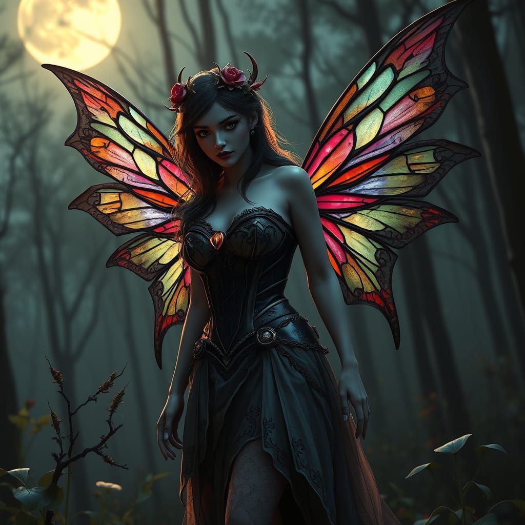 This enchanting image showcases a gothic fairy in a corset dress, surrounded by the mystical atmosphere of a forest under moonlight. The artwork features intricate details and deep colors, blending fantasy and reality in a captivating way.