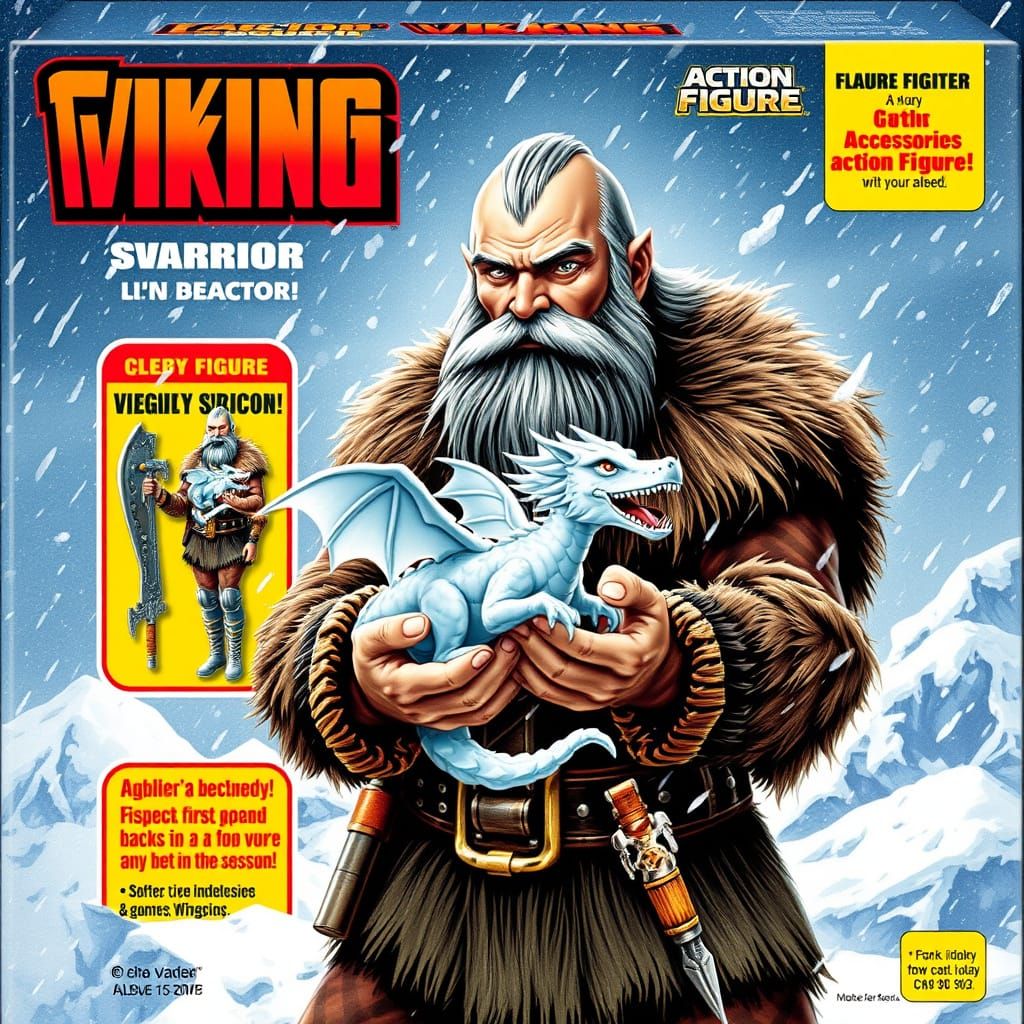This image shows a retro-style action figure box featuring a powerful elderly Viking warrior holding a tiny, adorable white dragon in a snowy scene. The design is reminiscent of classic 1980s action figure packaging with vibrant colors and dynamic illustrations.