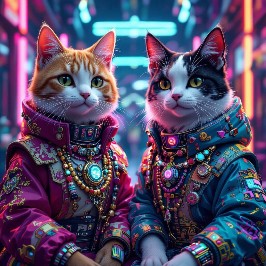 This image shows cats and dogs adorned with colorful clothing and futuristic jewellery, posing in a neon-lit setting. The image has hyperrealistic textures and lighting, with a blend of 3D anime and concept art aesthetics.