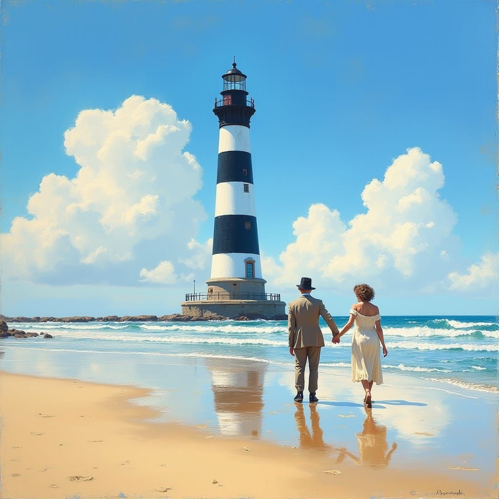An oil painting in a classic, impressionistic style depicting a black and white striped lighthouse standing tall on a sandy beach. The lighthouse's silhouette is prominently featured against a vibrant blue sky punctuated by fluffy white clouds. Two figures, a man and a woman, stand in the foreground, observing the majestic structure. The wet sand at the base of the lighthouse reflects its image, creating a shimmering mirror-like surface. The artist uses a palette of rich blues and warm sandy tones, juxtaposing against the stark black and white of the lighthouse. The painting uses a soft focus technique, emphasizing the beauty of the natural light and adding a sense of tranquility to the scene. The composition creates a balanced and harmonious scene that captures the serenity of the beach with a touch of drama and romanticism.