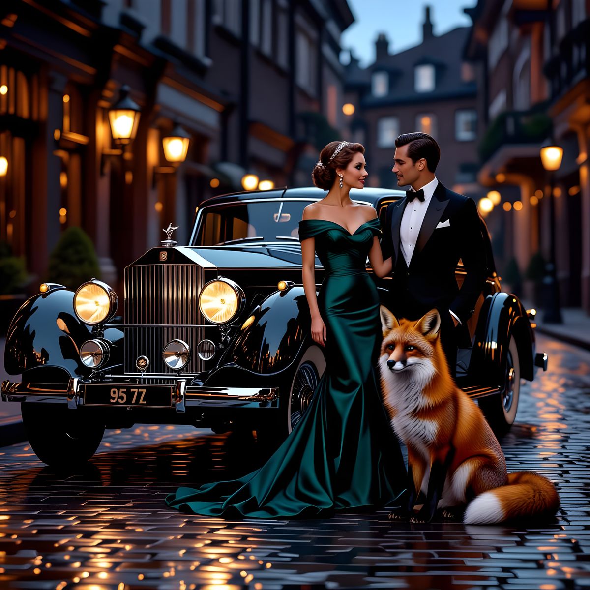 This image depicts a vintage luxury car at twilight, with a sophisticated woman and an anthropomorphic fox. Rendered in a realistic, painterly style with rich colors, it evokes timeless glamour and camaraderie.