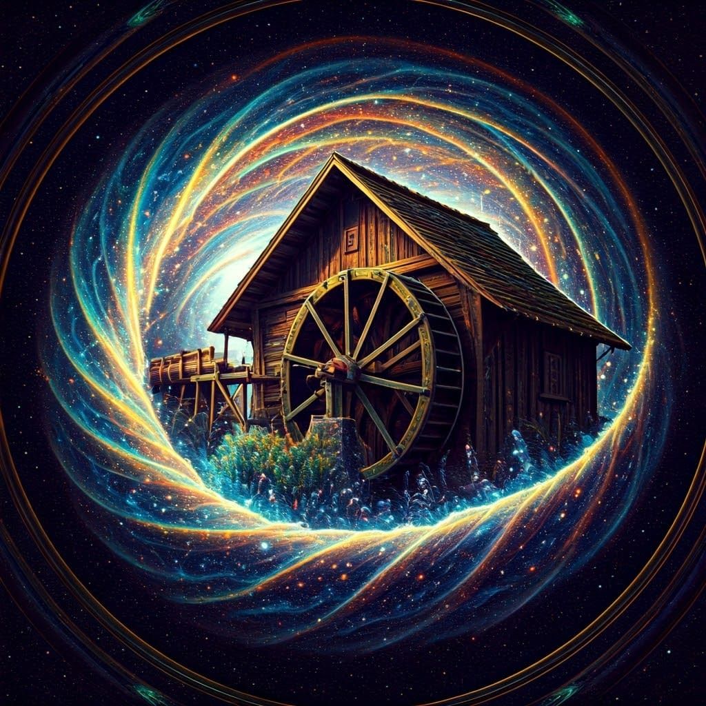 This image shows a vibrant, ethereal watermill surrounded by a swirling vortex of stars, stardust, and celestial gases, with intricate, layered textures and patterns reminiscent of mystical visionary art. The mill's ancient machinery glows with iridescent, shimmering blades crafted from stardust and ener...