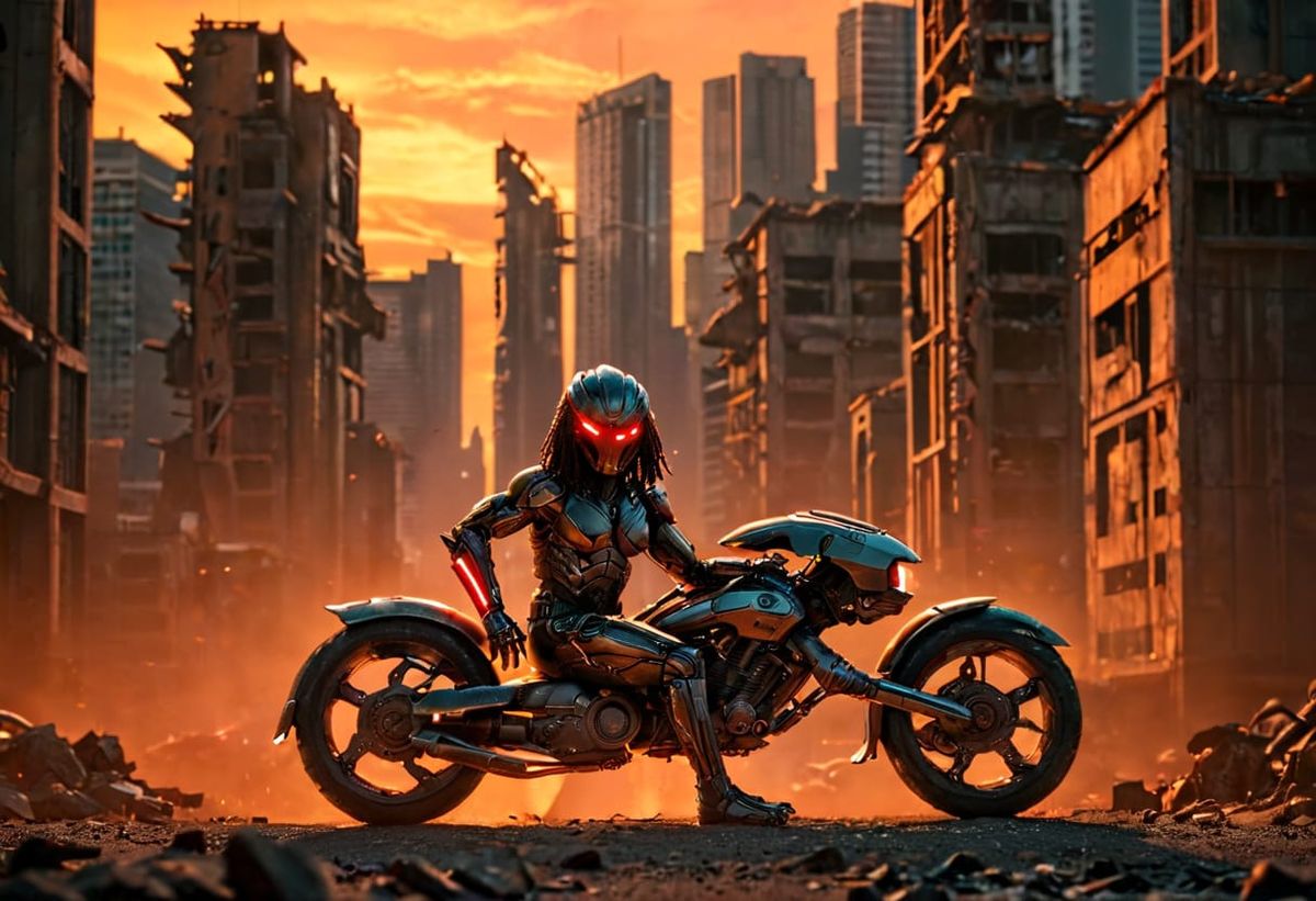 This image is a high-resolution, cinematic film still featuring a biomechanical motorcycle and the Predator in a dark, gritty, dystopian cityscape with neon hues and deep shadows.